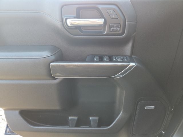 The exterior of this Sierra AT4 is dressed in a bold Pacific Blue Metallic color, complemented by the signature AT4 styling cues, including 20-inch machined aluminum wheels with carbon gray metallic accents, black exterior accents, and a body-color grille surround. The AT4 package also adds a premium off-road suspension, all-terrain tires, and red recovery hooks for enhanced capability.