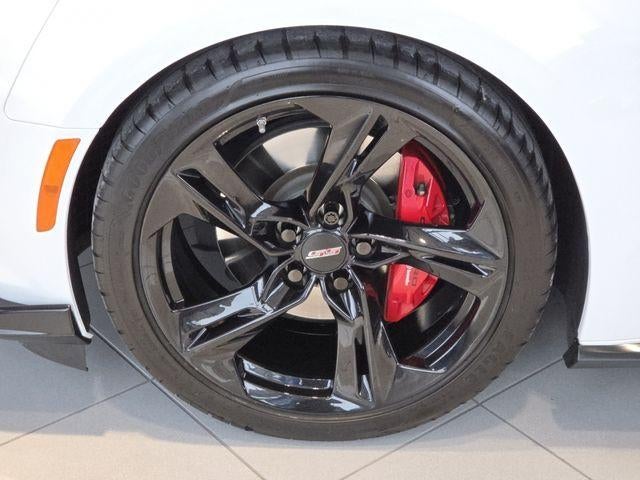 Dressed in a stunning White exterior, this Camaro stands out with its aggressive and athletic styling. The Satin Black Front Splitter/Side Rockers Package, Body-Color Spoiler with Wicker Package, and Satin Black Hood Stripe with Red Hot Hash Mark add a touch of menacing flair, while the 20-inch 5-spoke Carbon Flash Painted Aluminum wheels give it a commanding presence on the road.